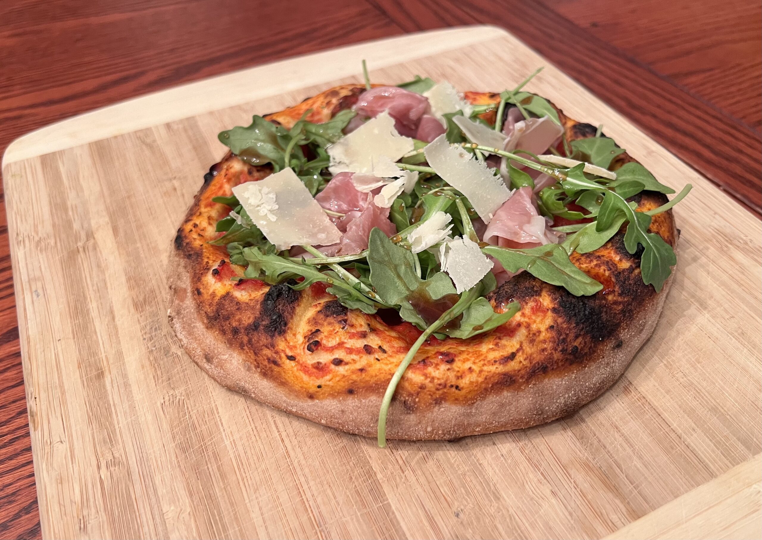 Tomato sauce, fresh mozzarella cheese, fresh prosciutto, arugula, topped with shaved parmesan cheese and balsamic glaze