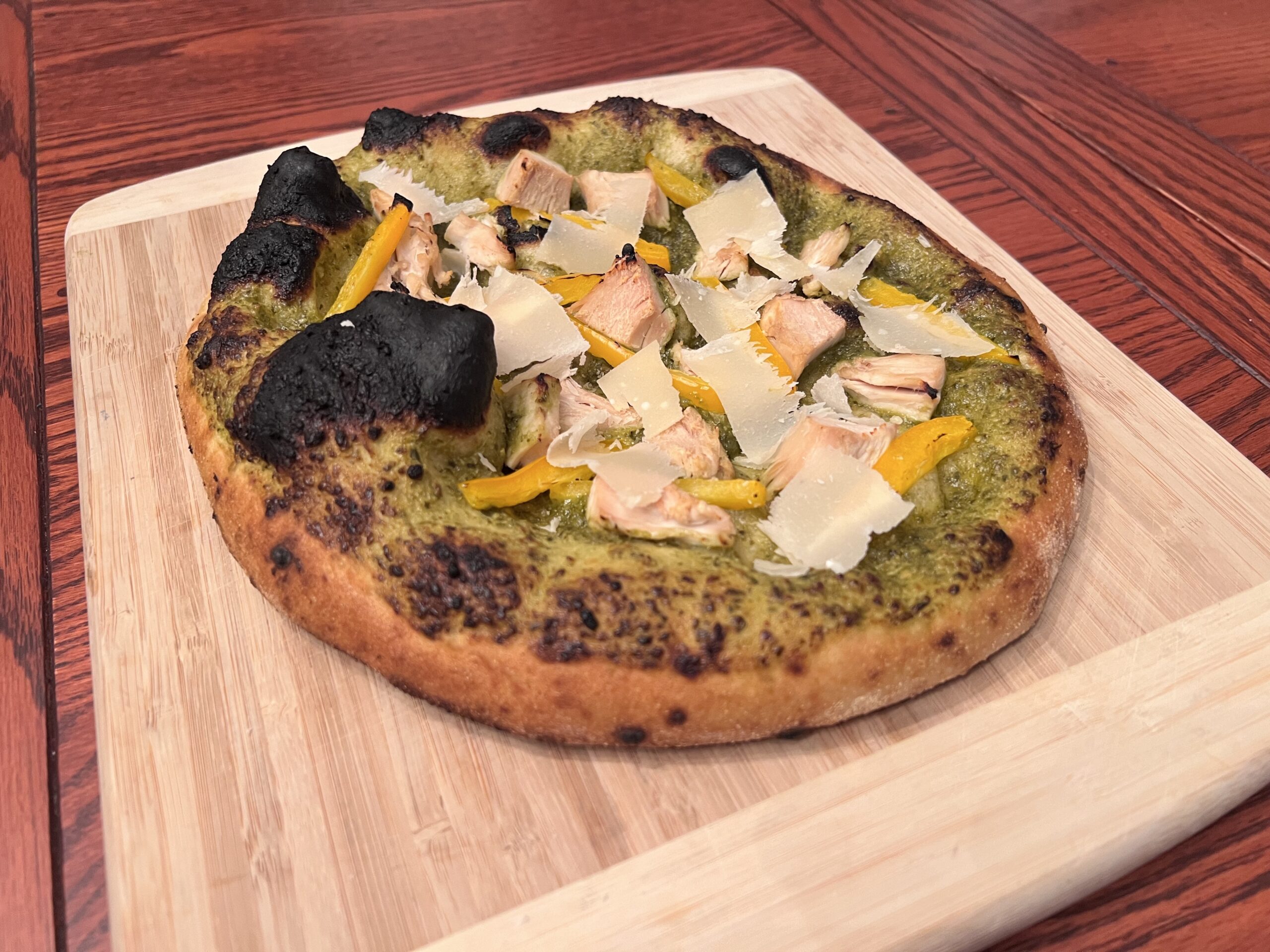 Pesto, grilled chicken, peppers, topped with shaved parmesan cheese